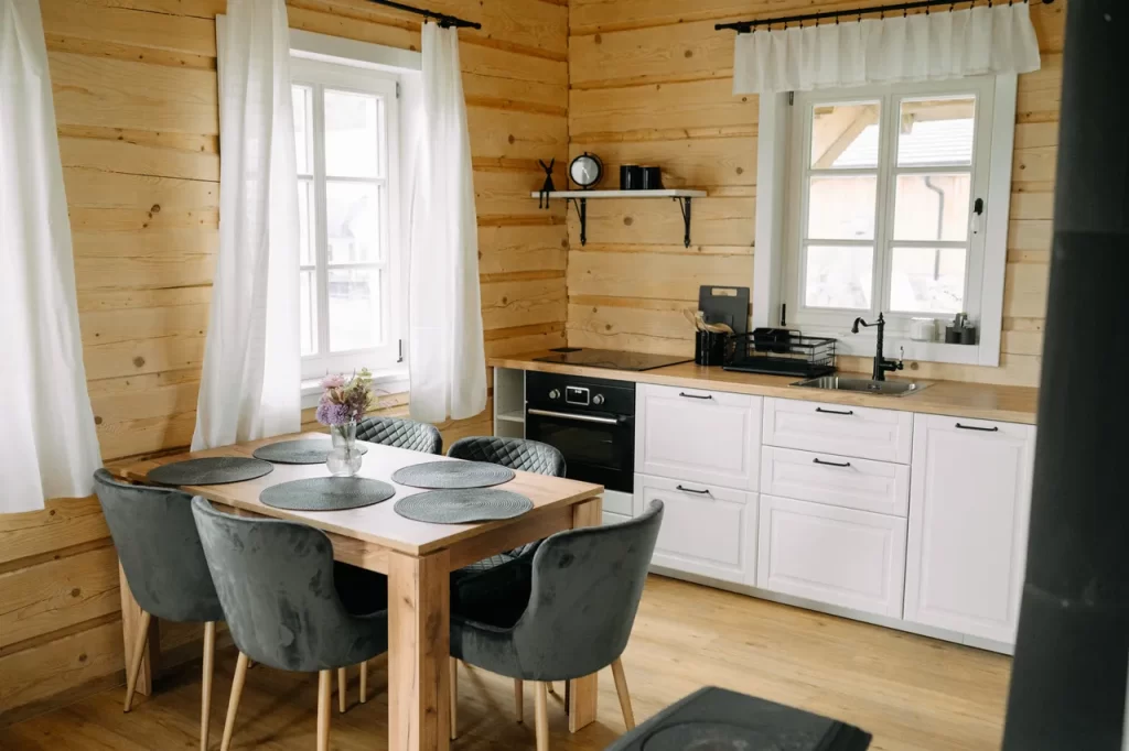 V obývacím pokoji jsou krbová kamna, televize, kuchyňšký kout s nádobím, varnou deskou, El. Troubou, varnou konvicí, kávovar Dolce Gusto, lednicí s mrazákem. V patře ěx pokoje 3+2. Možnost půjčení dětské postýlky, wc, povlečení postelí. Každý apartmán má vlastní připojení k wifi.